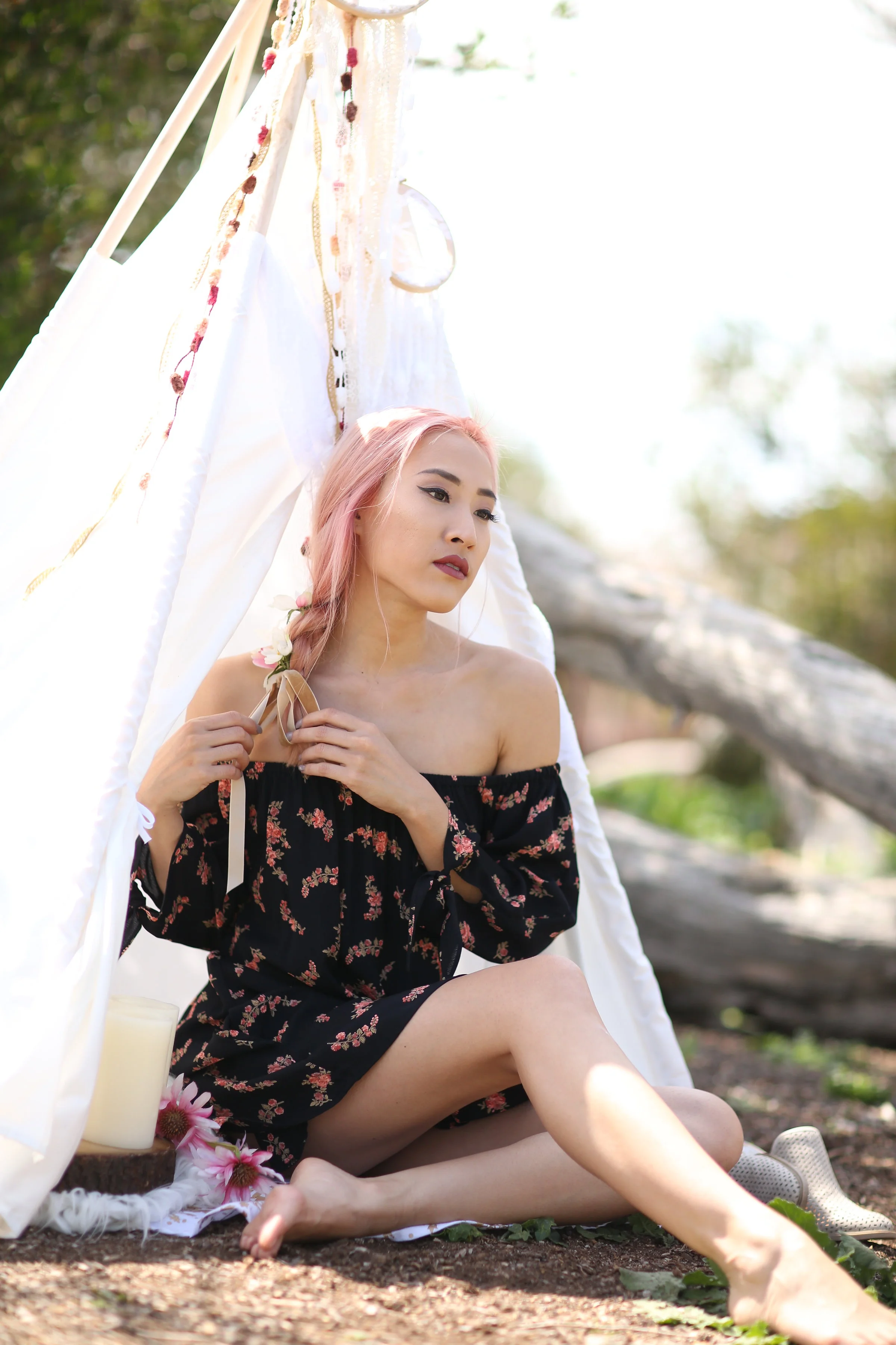 Shawna introduced me to this amazing perfume, Melissa Flagg Hawaiian Botanicals in Alani which is the yummiest blend of sweet orange blossoms and floral gardenias; we included it in the teepee set up and stylized shoot. I'm obsessed with it and love the packaging as well. If you'd like more info on where I got the teepee, check out the first post of this Coachella festival-inspired style series. To create the hair look featured in this post, I simply braided my hair, tied the end with a velvet ribbon and placed faux flowers into the braid. You can try different braids and also play around with real flowers (small flowers like baby's breath looks pretty woven into braids). Also check out the first time I styled a Stevie Sister matching two piece outfit here. If you're based in OC, head over to Stevie Sister at Fashion Island and shop for your spring/summer wardrobe!
