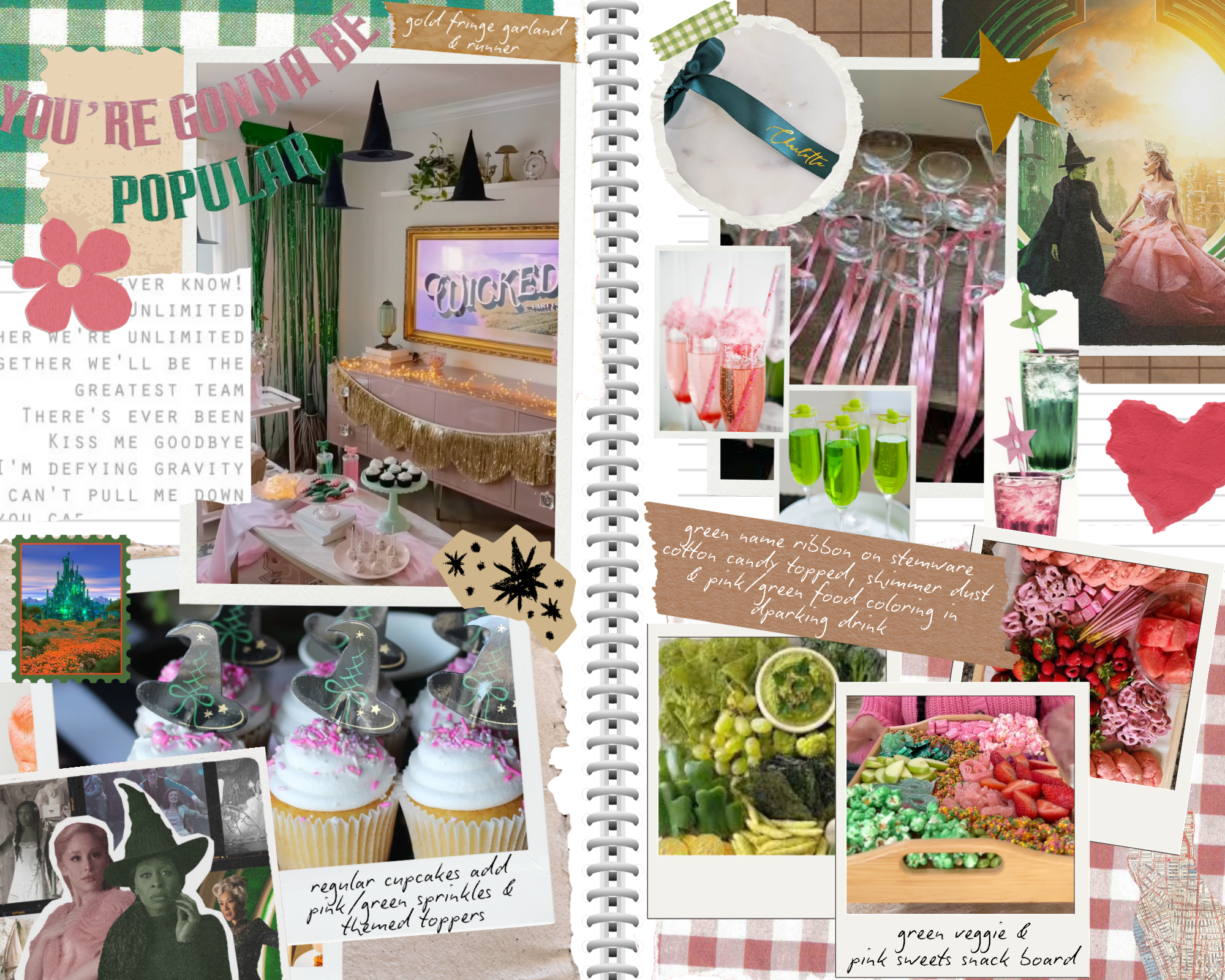 My friend Michelle and I hosted a Wicked Watch Party, and I am so excited to show you how it turned out. Since she wants to see the newest Wicked: For Good, but hadn’t seen the first movie, I suggested doing a watch party to get her all caught up! She handled hosting at her home and creating the snack chracuterie board, and I took care of the decor and some other fun details for our party! Check out our mood board, how do you think it all turned out from our inspiration?!